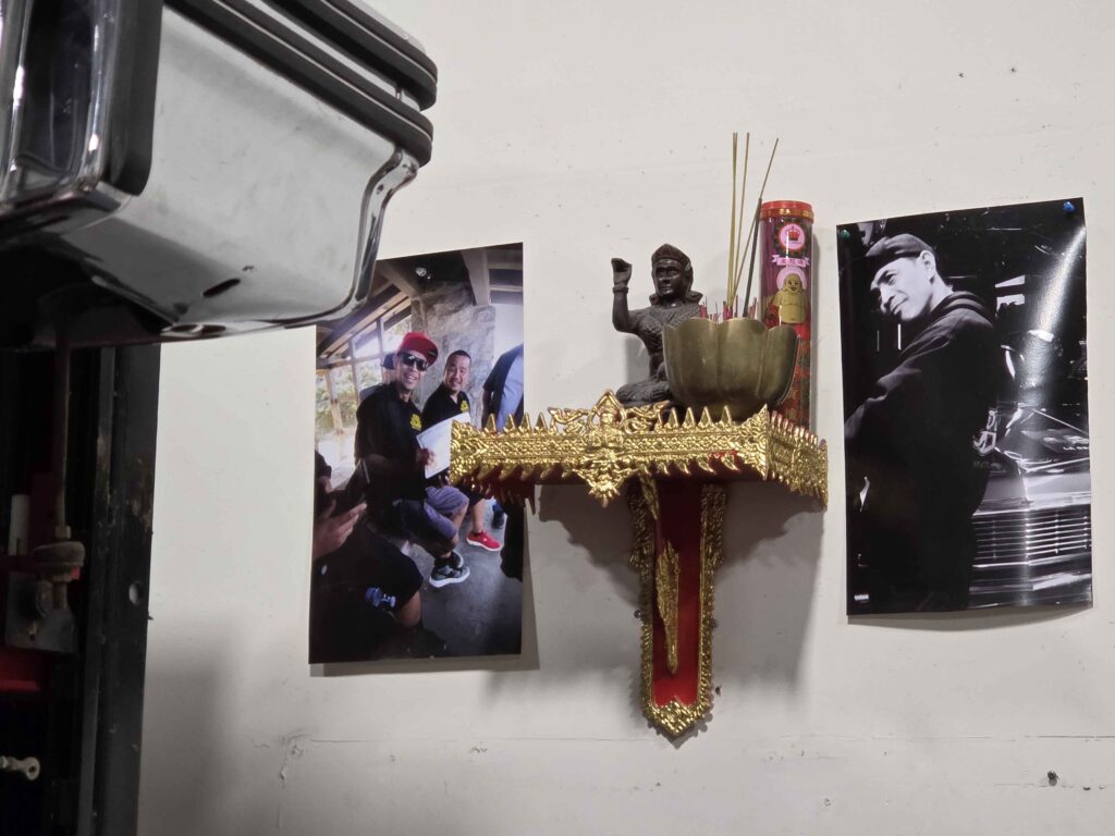 Loud stereo music mixes with the sound of car engines in an out-of-the-way garage in Kent. In the corner of the garage is a small shrine with a statue of Nang Kwak, the Thai spirit of good fortune, sitting next to a bowl of incense and two photos of Eazy Duz It club members.
